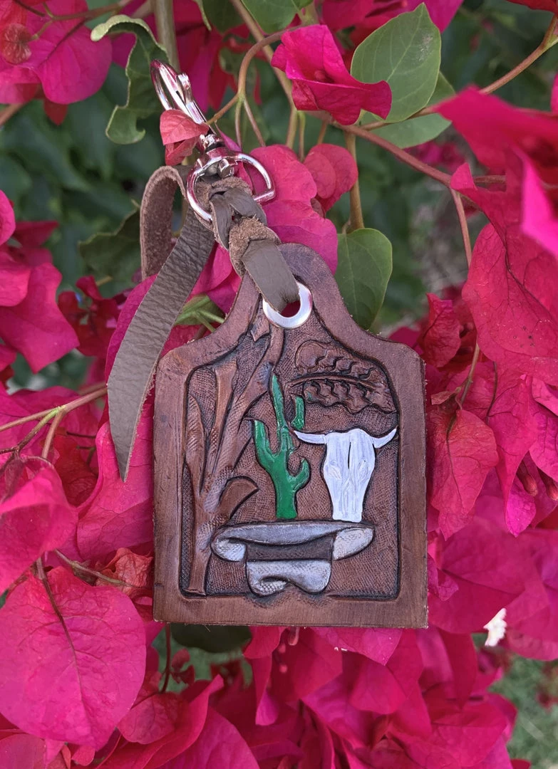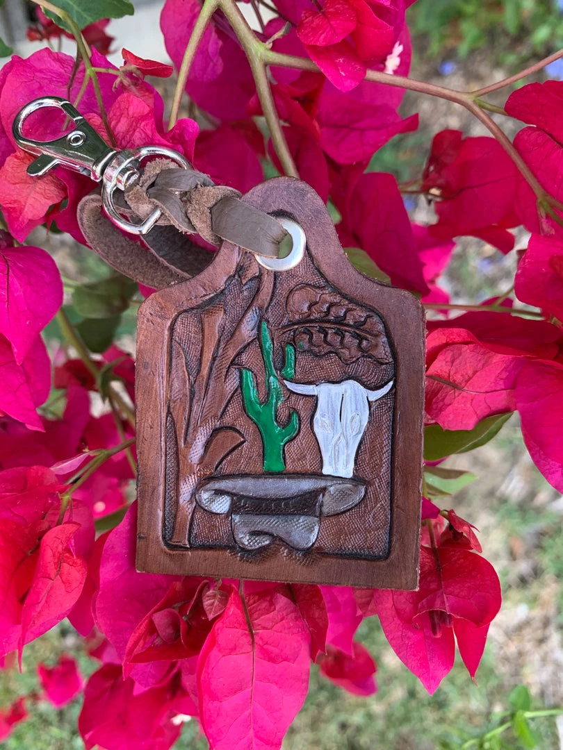Cincelado (tooled) keychain with bull, cactus, and texana design