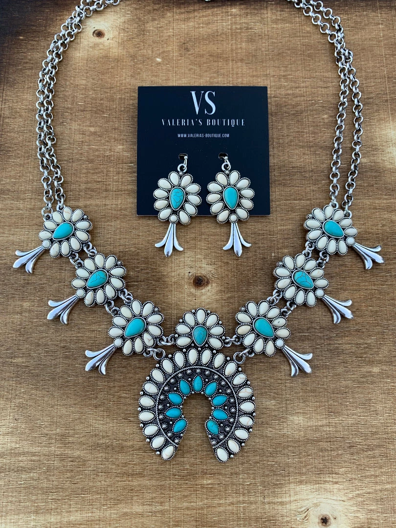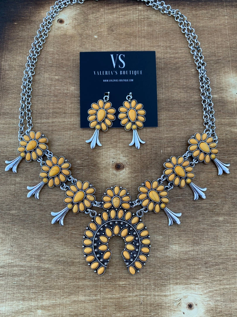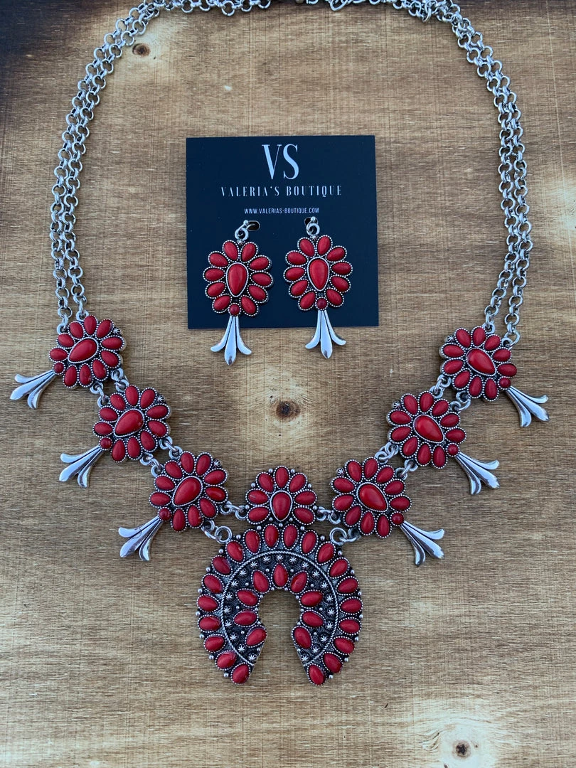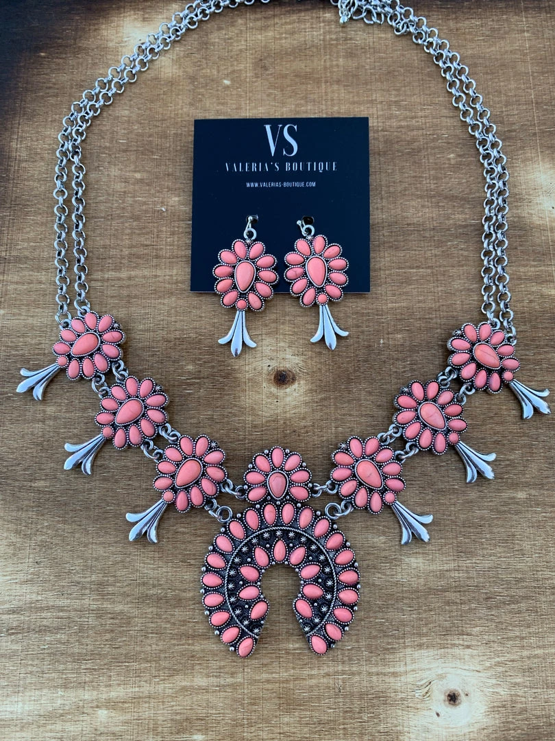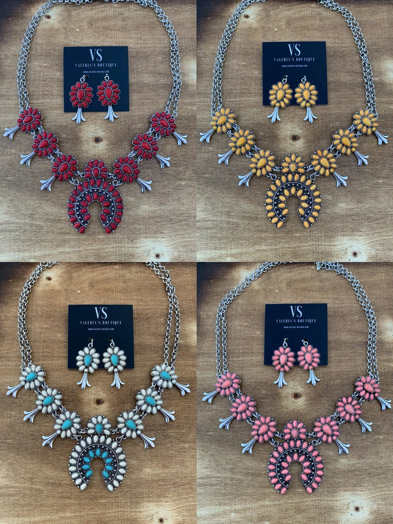 Be the first to review “Valeria’S Boutique Rounded Squash Blossom Necklace Set (Red, Yellow, White & Turquoise, & Peach)” Cancel reply