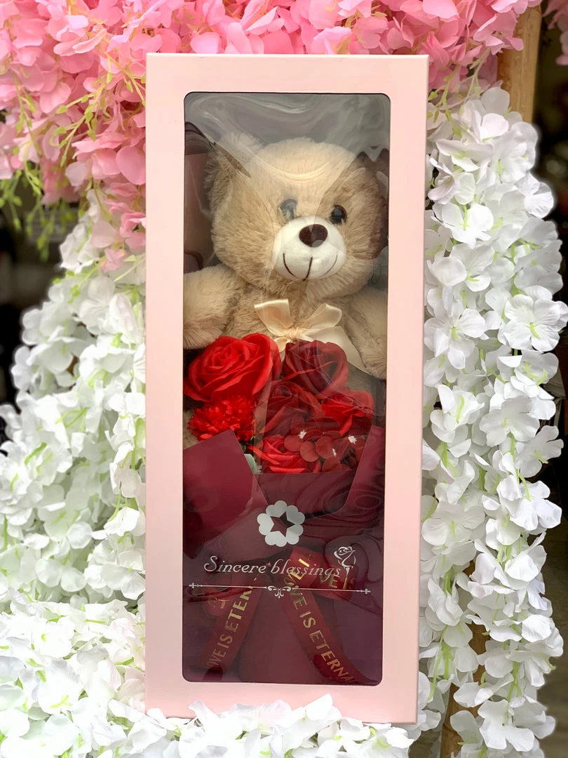 Included: teddy bear, flower bouquet, bouquet wrapping paper with ribbon, and box with lid