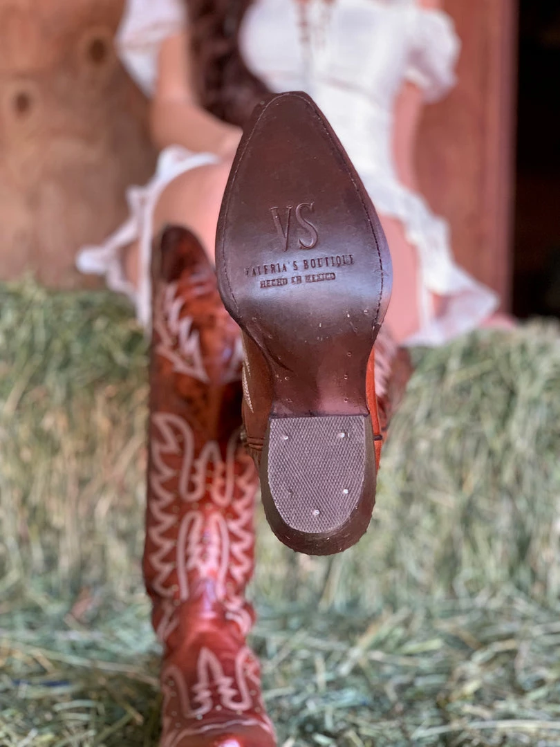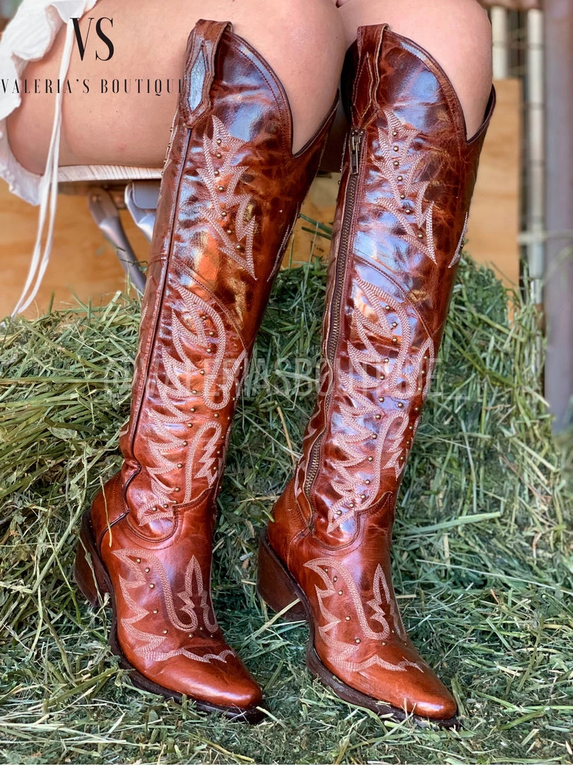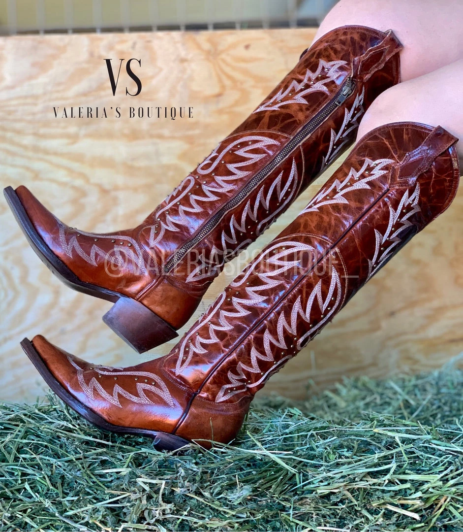 These boots run true to size. We recommend going up half a size bigger only if you have wide calves. Additionally, the calf area has slightly limited space. The cognac color of Valeria’S Boutique Tall Western Boots runs slightly smaller than the black color.